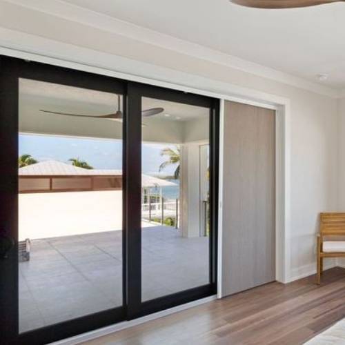 Vertical cellular shades, motorized panels, and light-filtering rollers offer coverage and ease of use for patio access points.