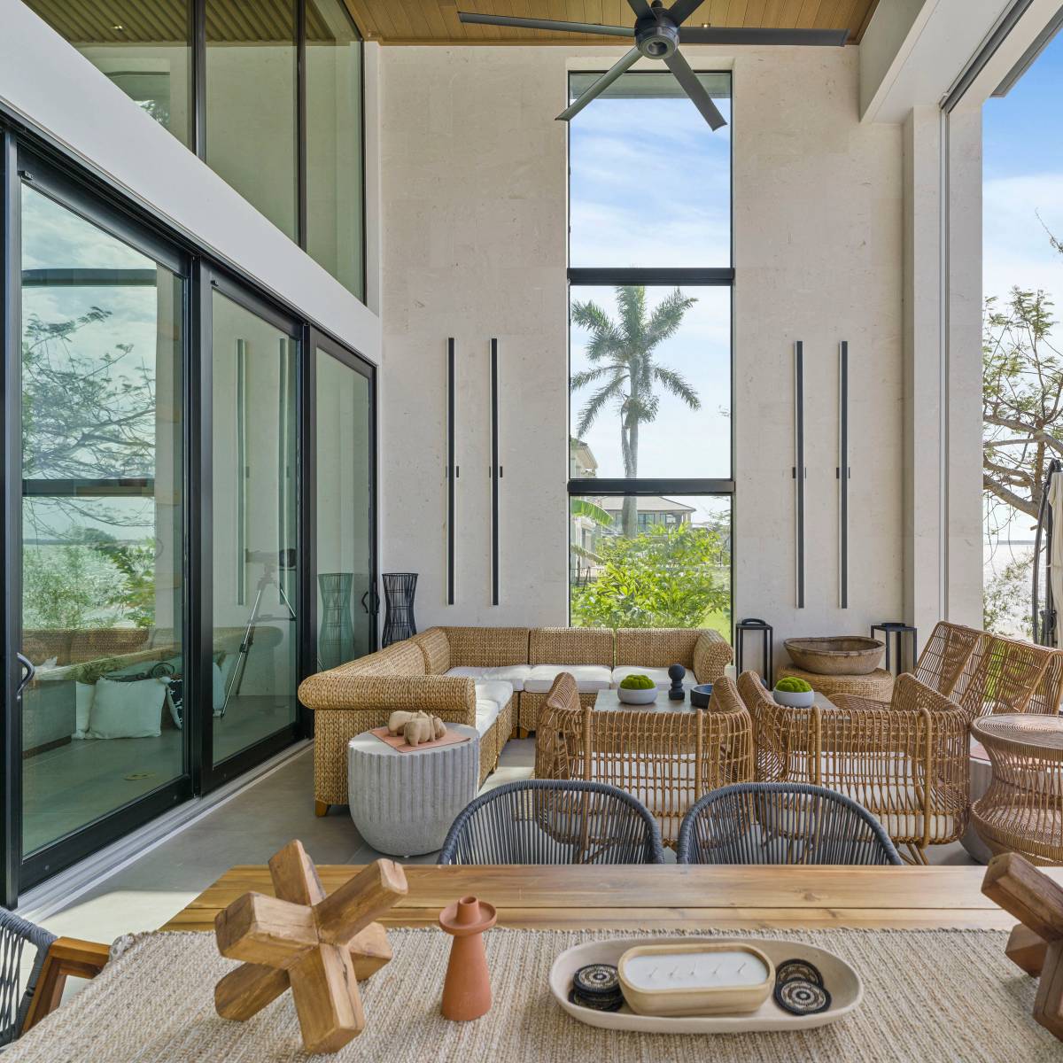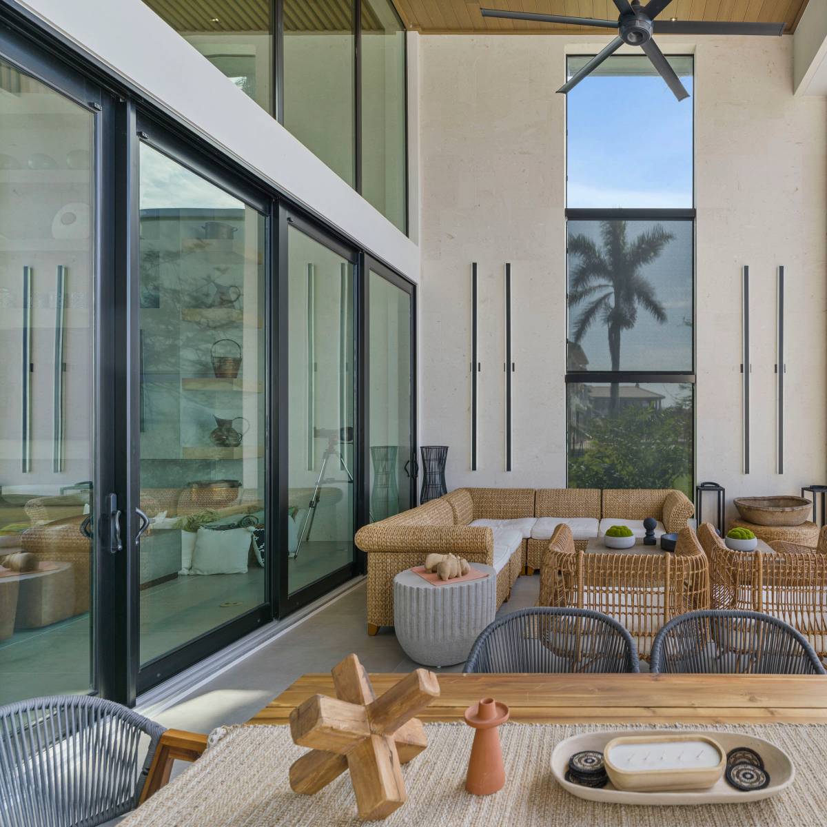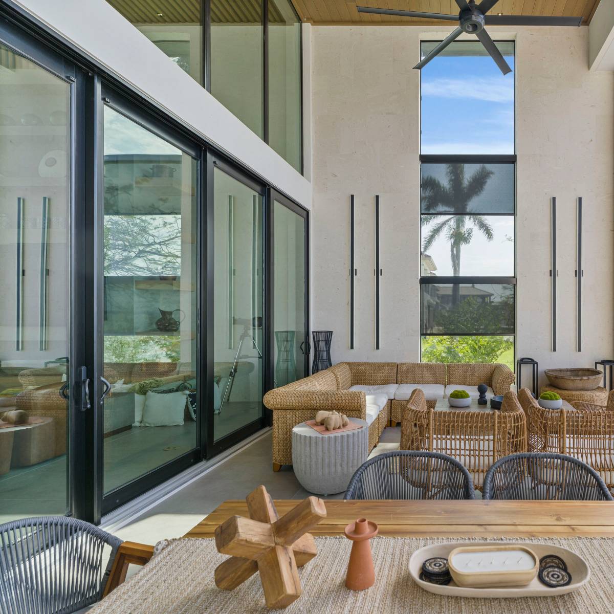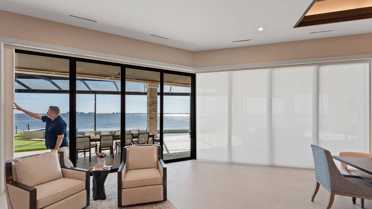 Motorized roller shades and vertical panels offer seamless coverage and convenience for large windows in Babcock Ranch homes.