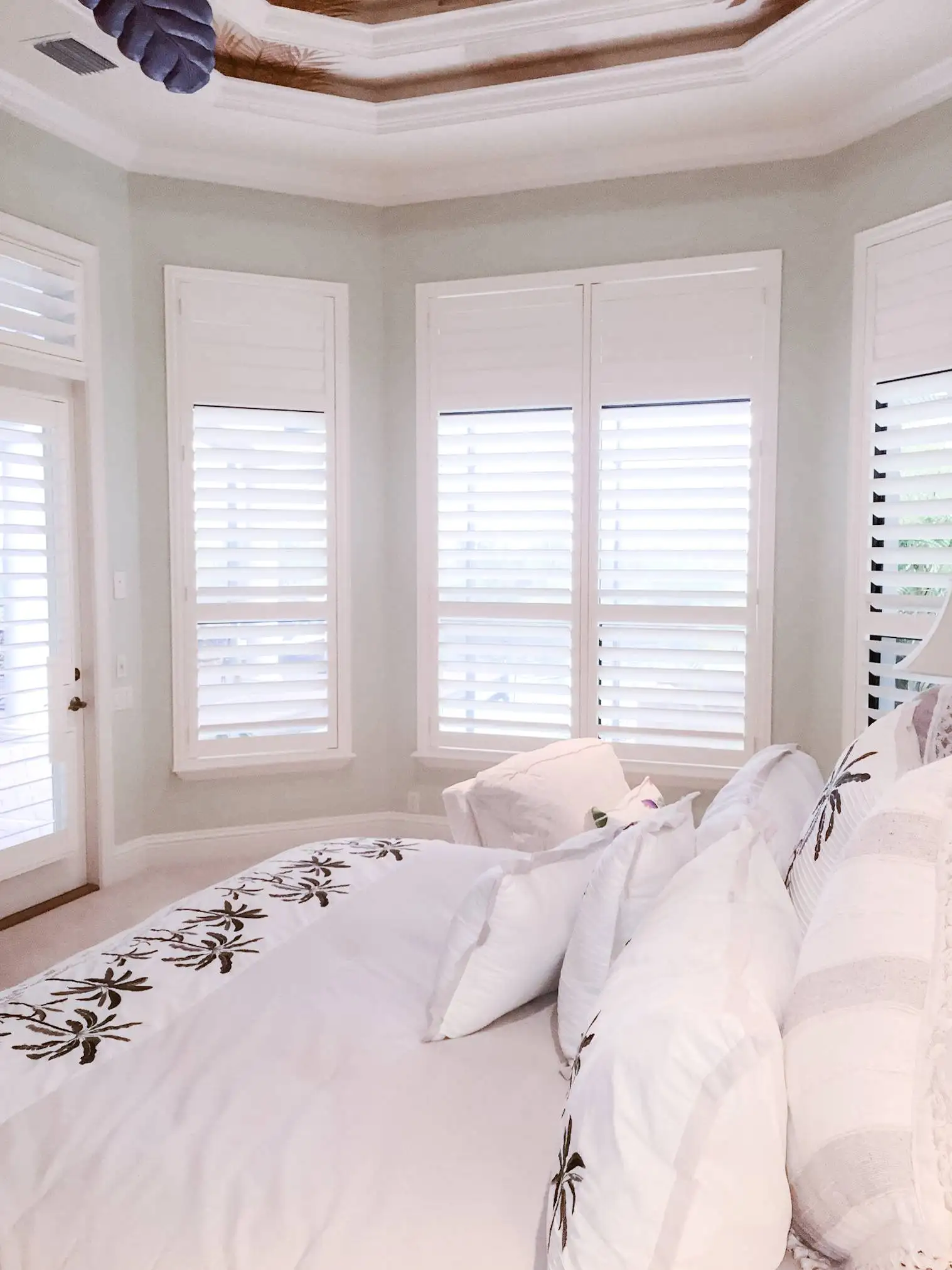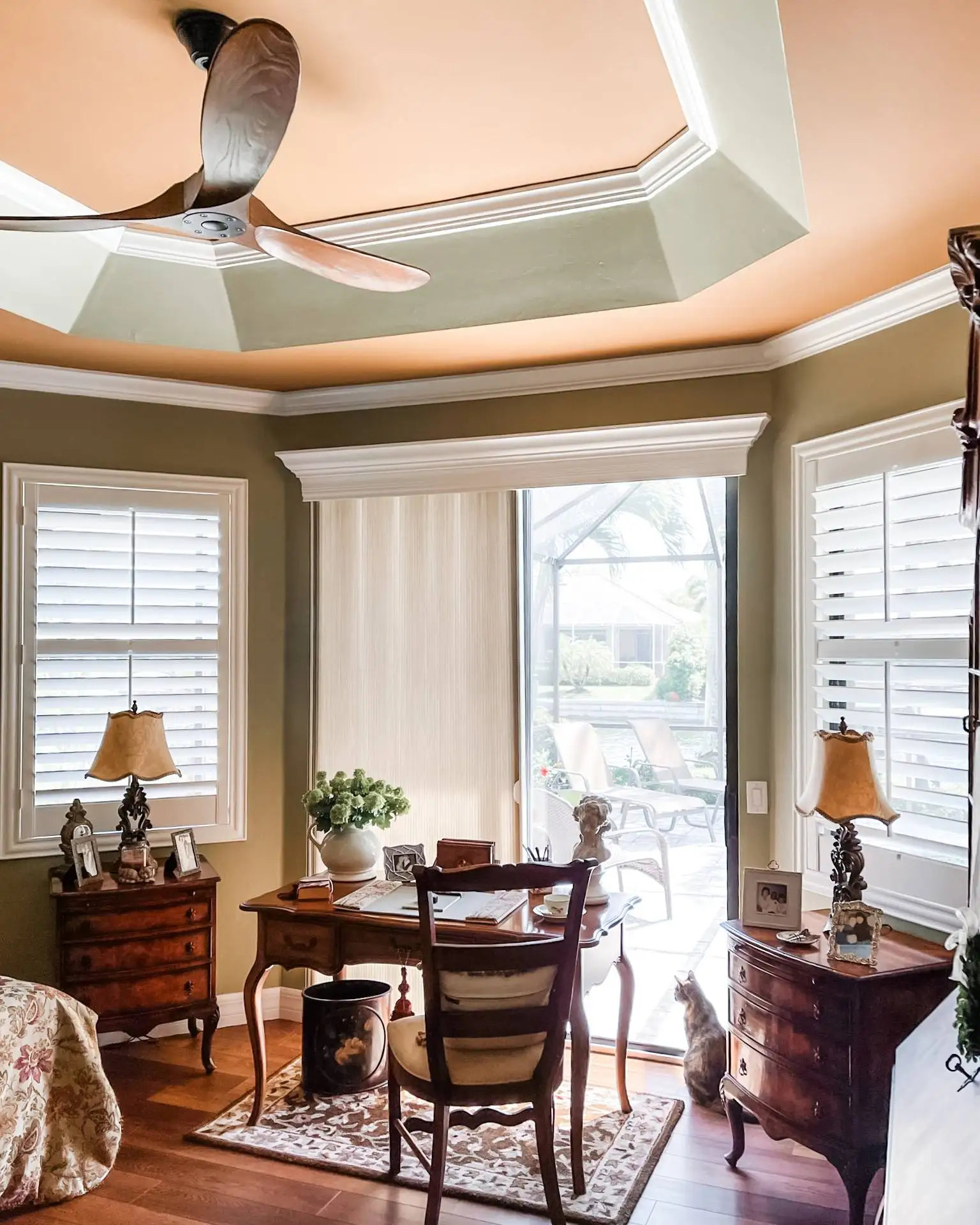 Woven wood, white shutters, and soft, light-filtering shades fit perfectly with Cape Coral’s breezy coastal design trend.