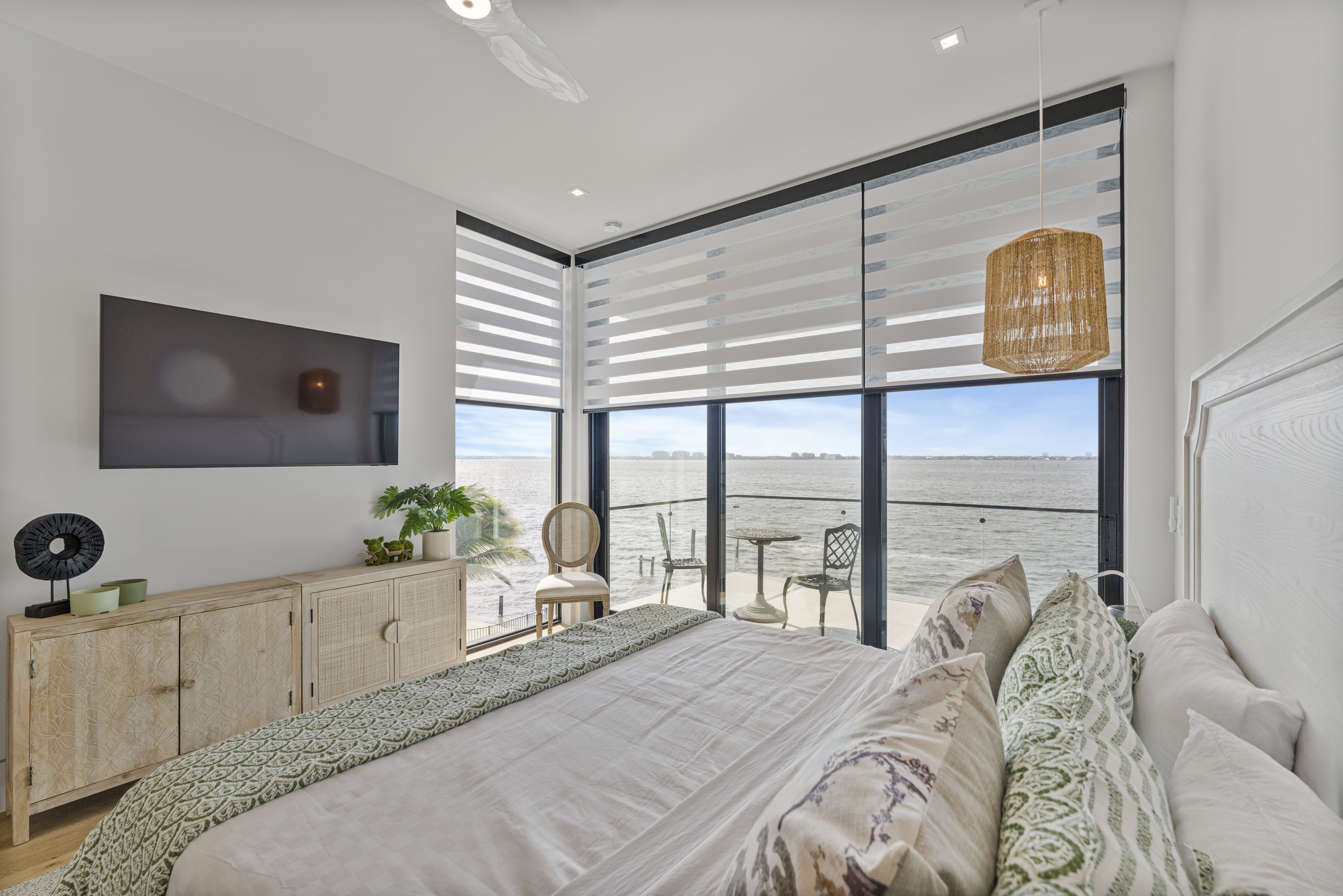 UV-filtering solar roller shades and layered zebra blinds help prevent fading and protect interiors from Florida’s intense coastal sun.