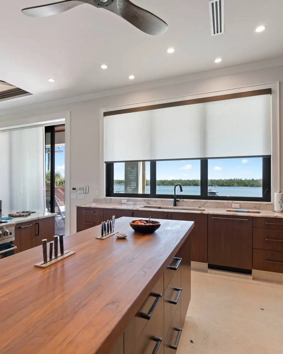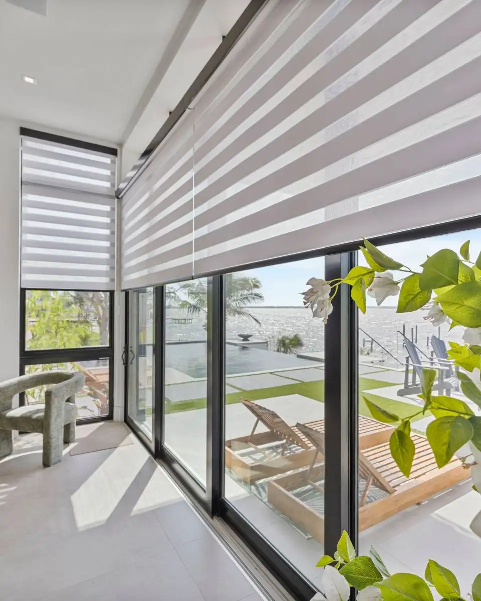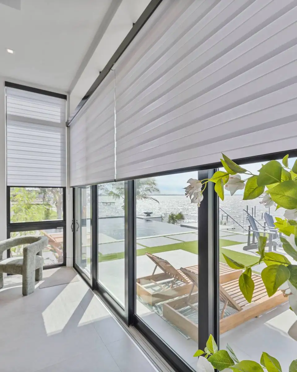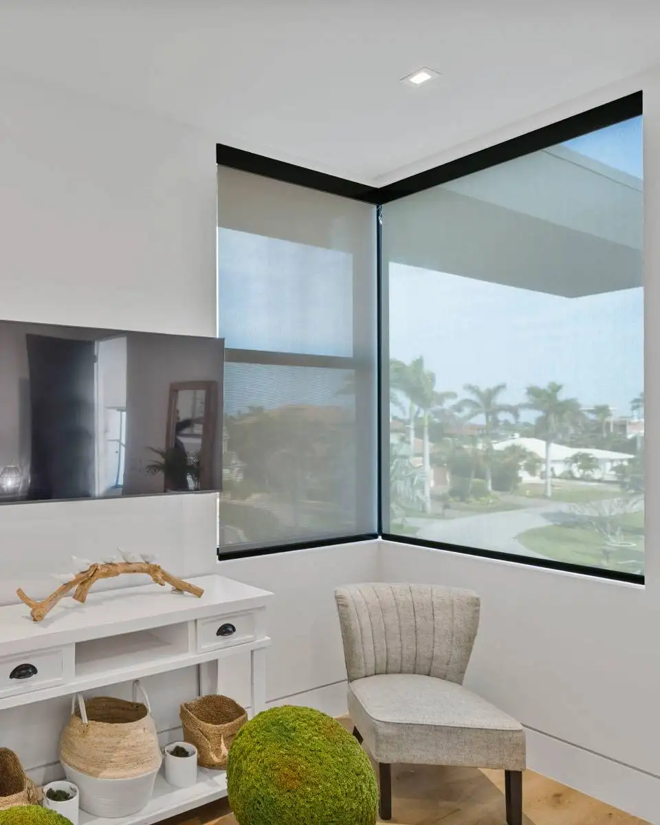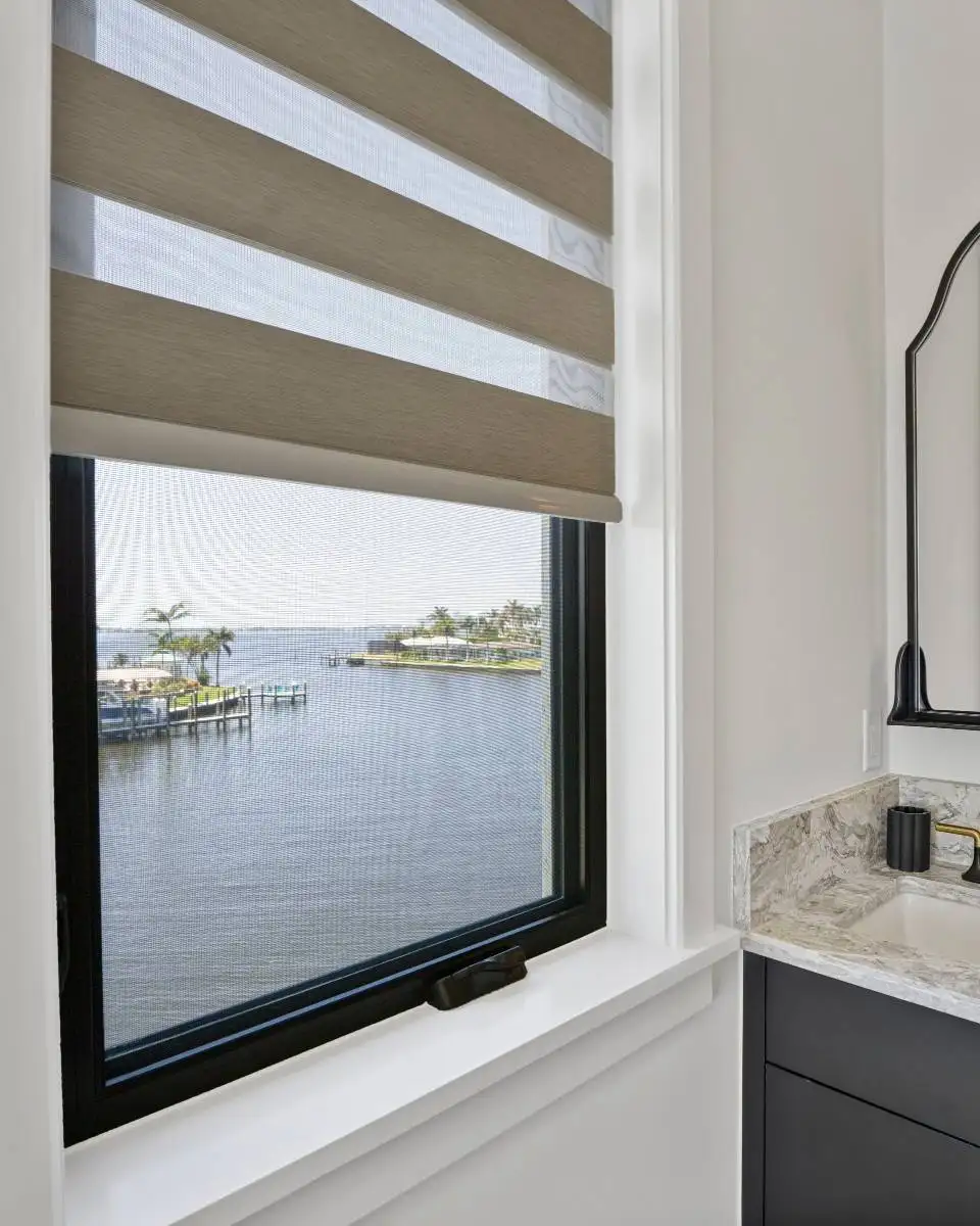 Solar screen shades and motorized sheers provide glare control while preserving views of the Gulf or canals.