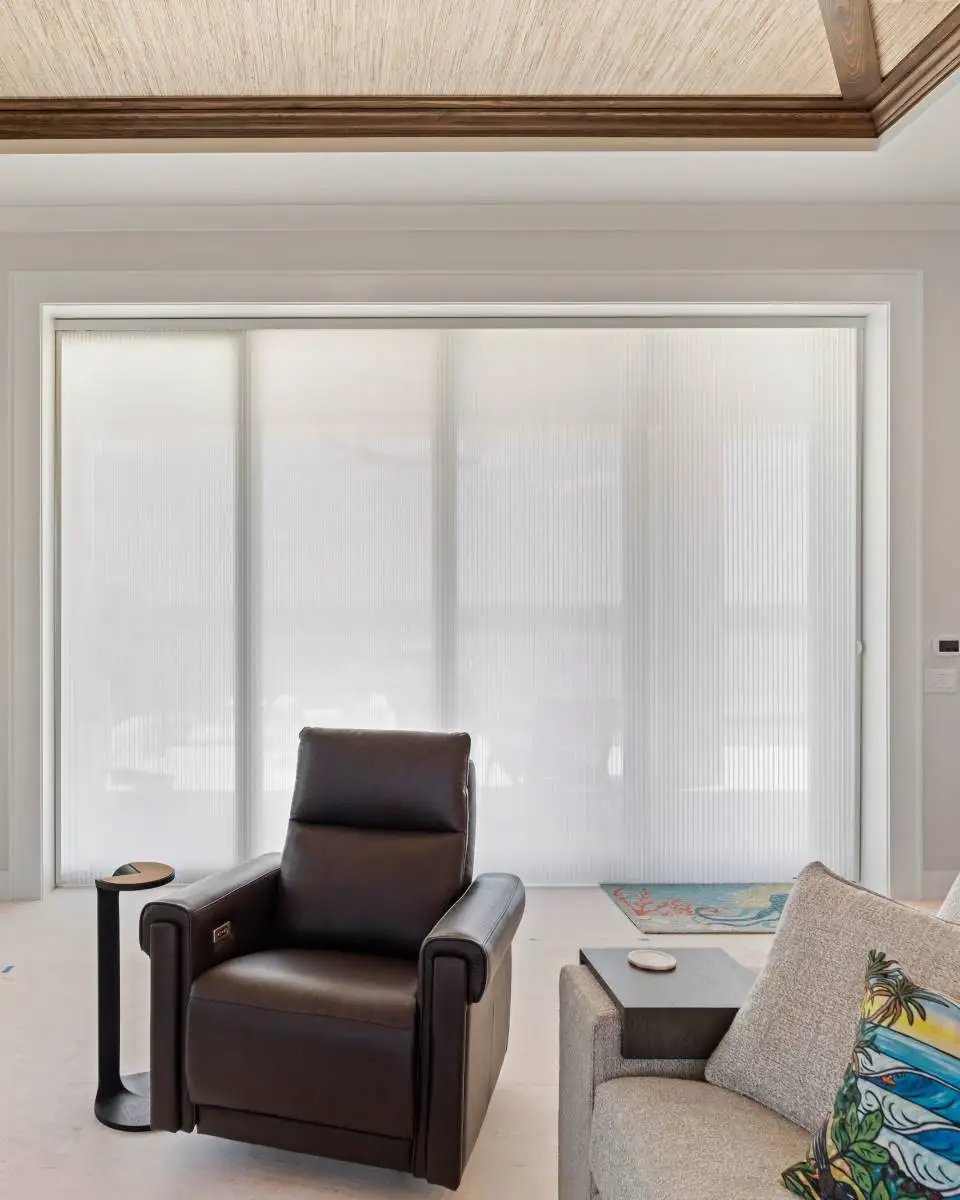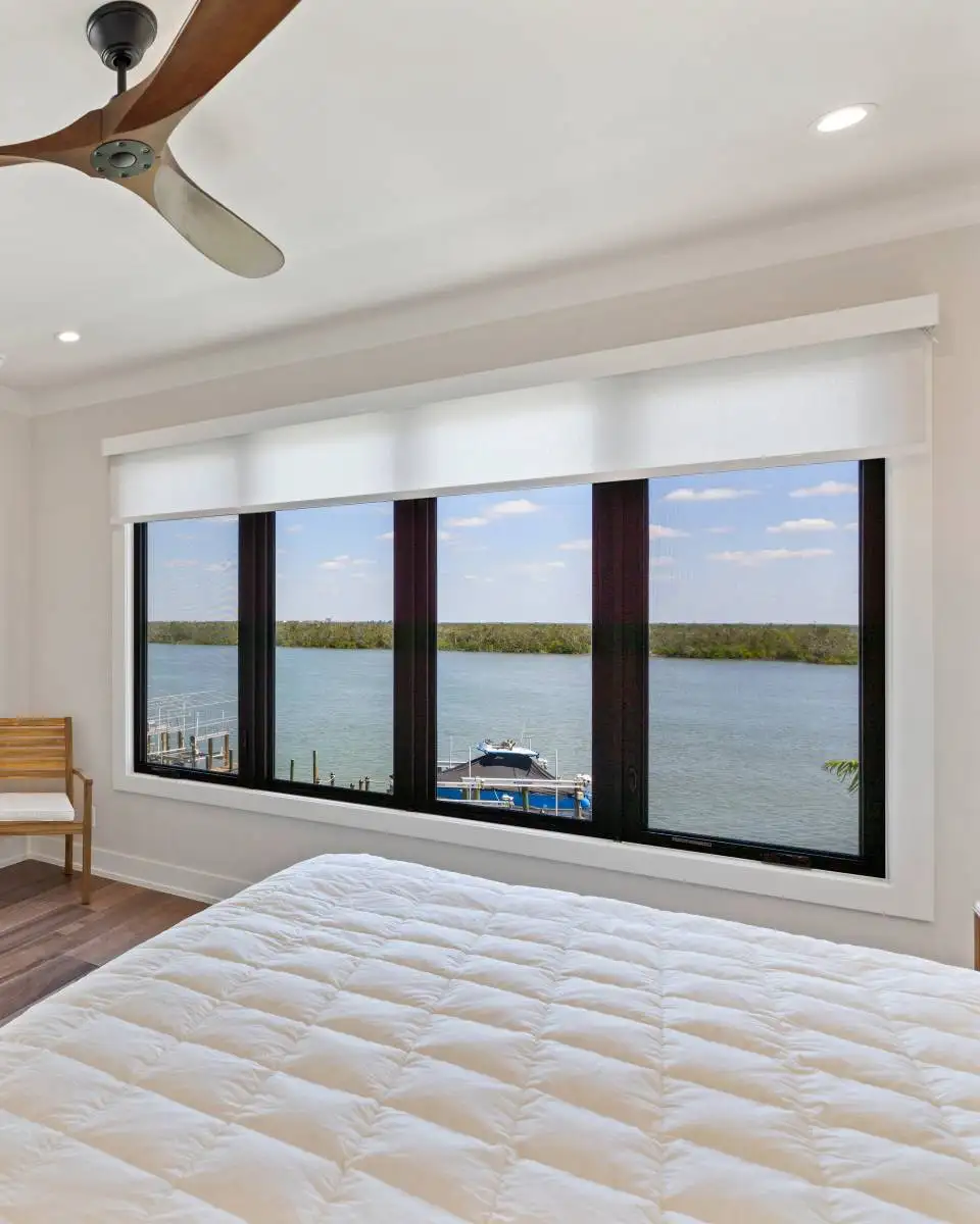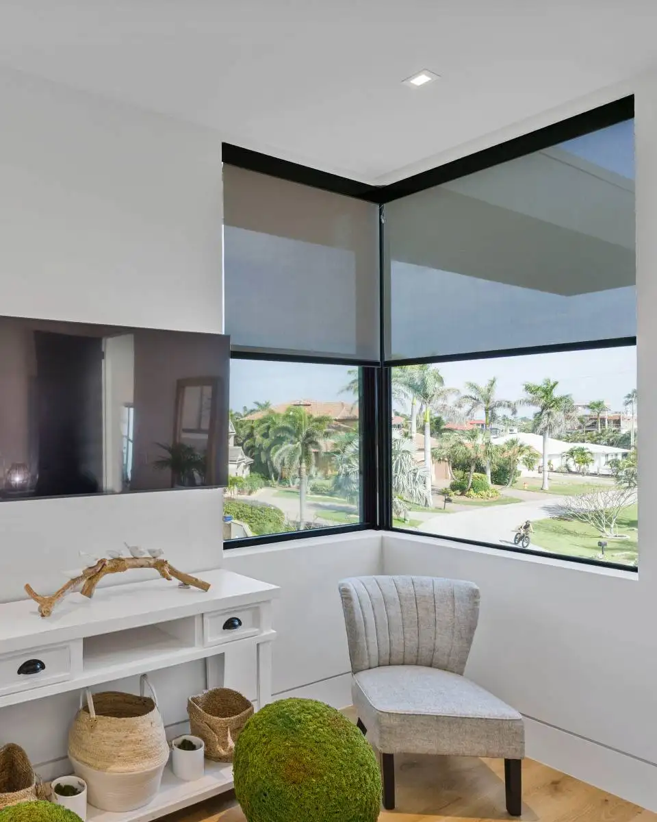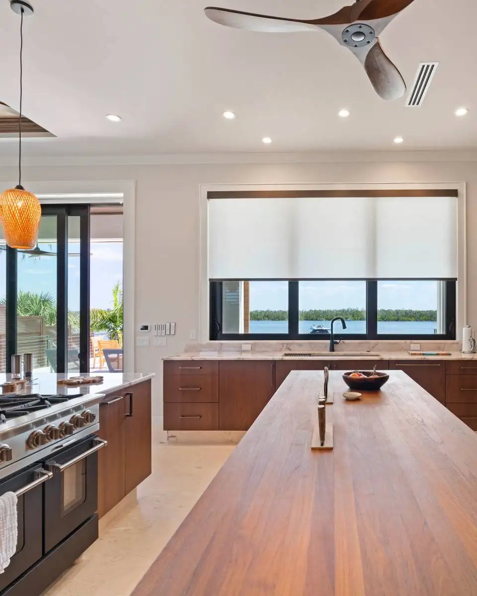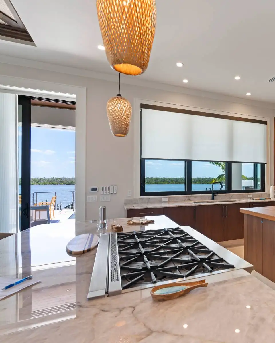 Solar screen shades and motorized sheers provide glare control while preserving views of the Gulf or canals.