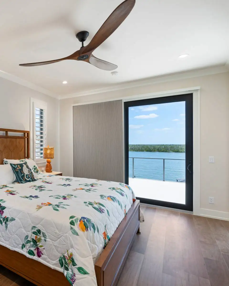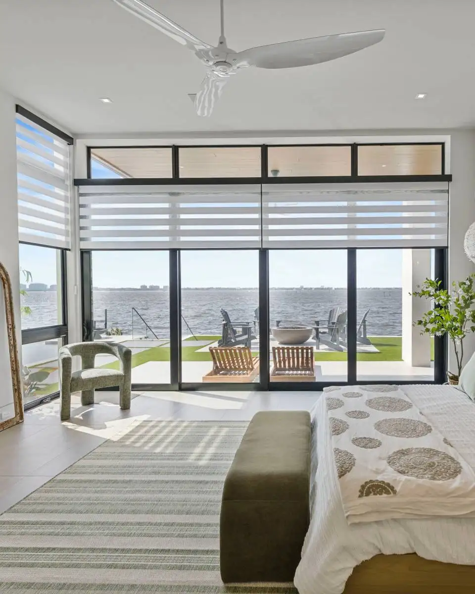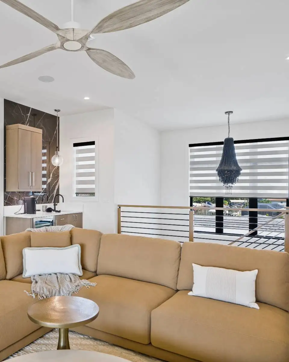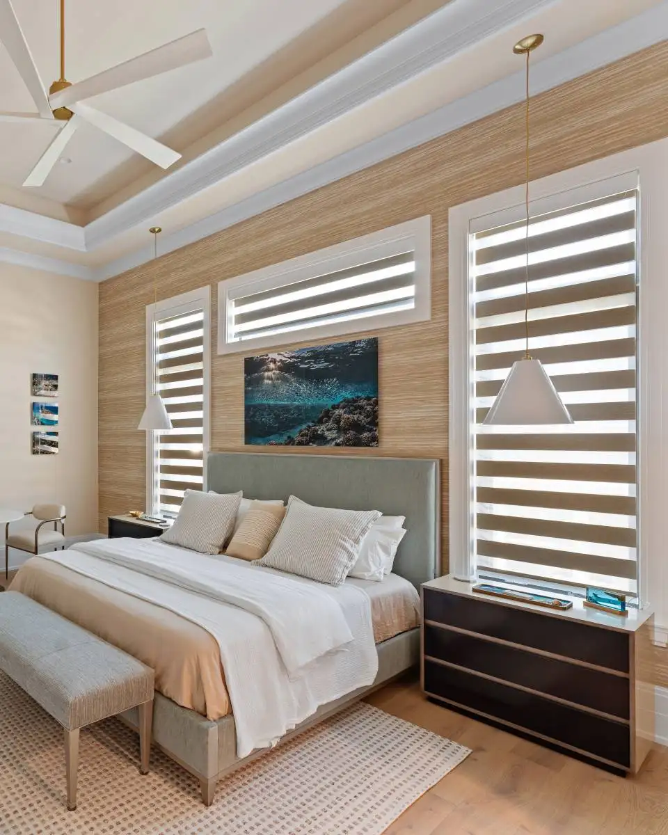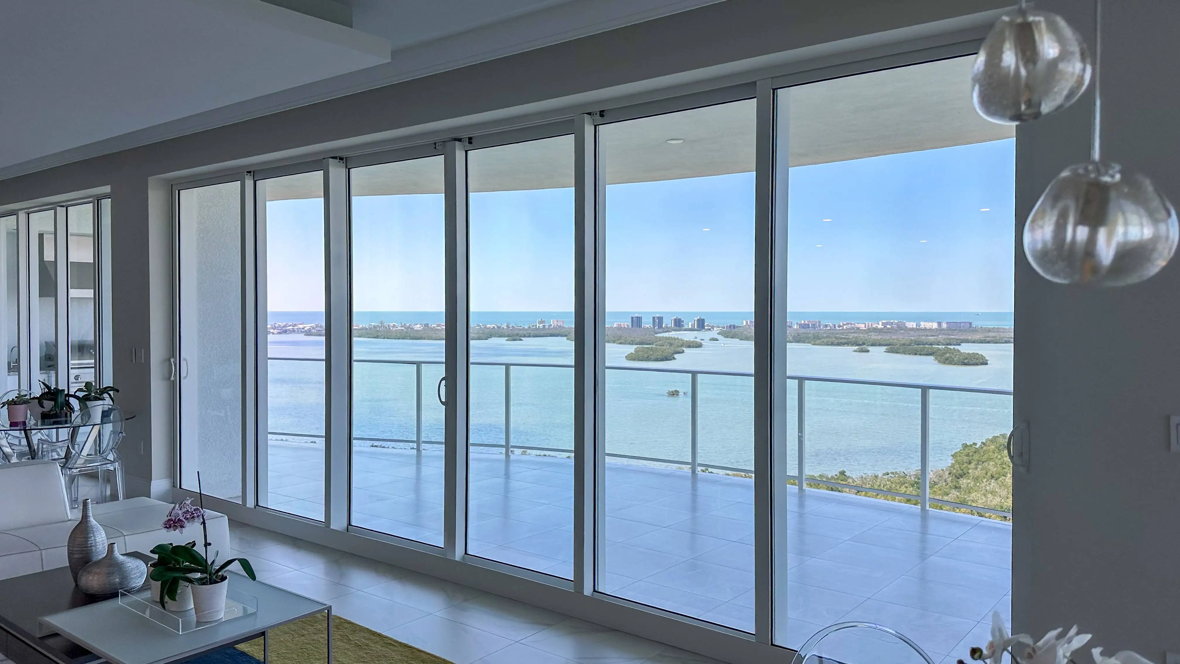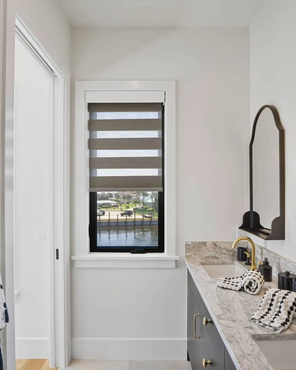 Solar screen shades and motorized sheers provide glare control while preserving views of the Gulf or canals.