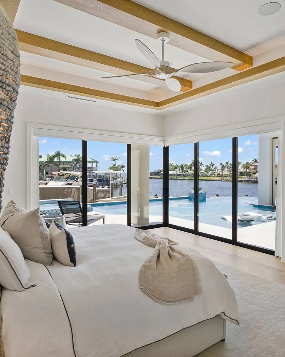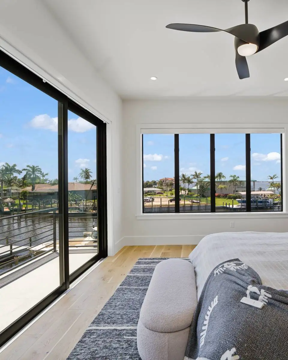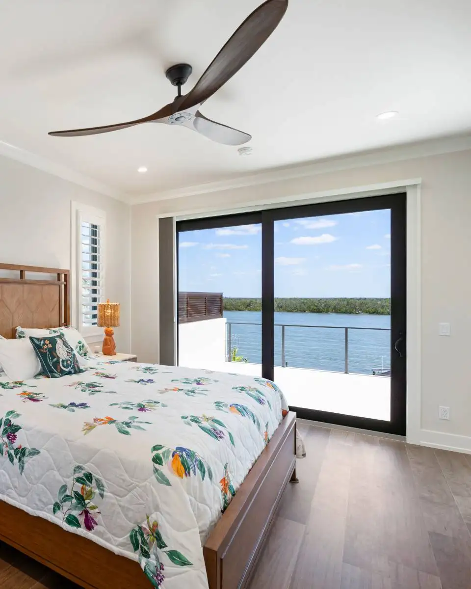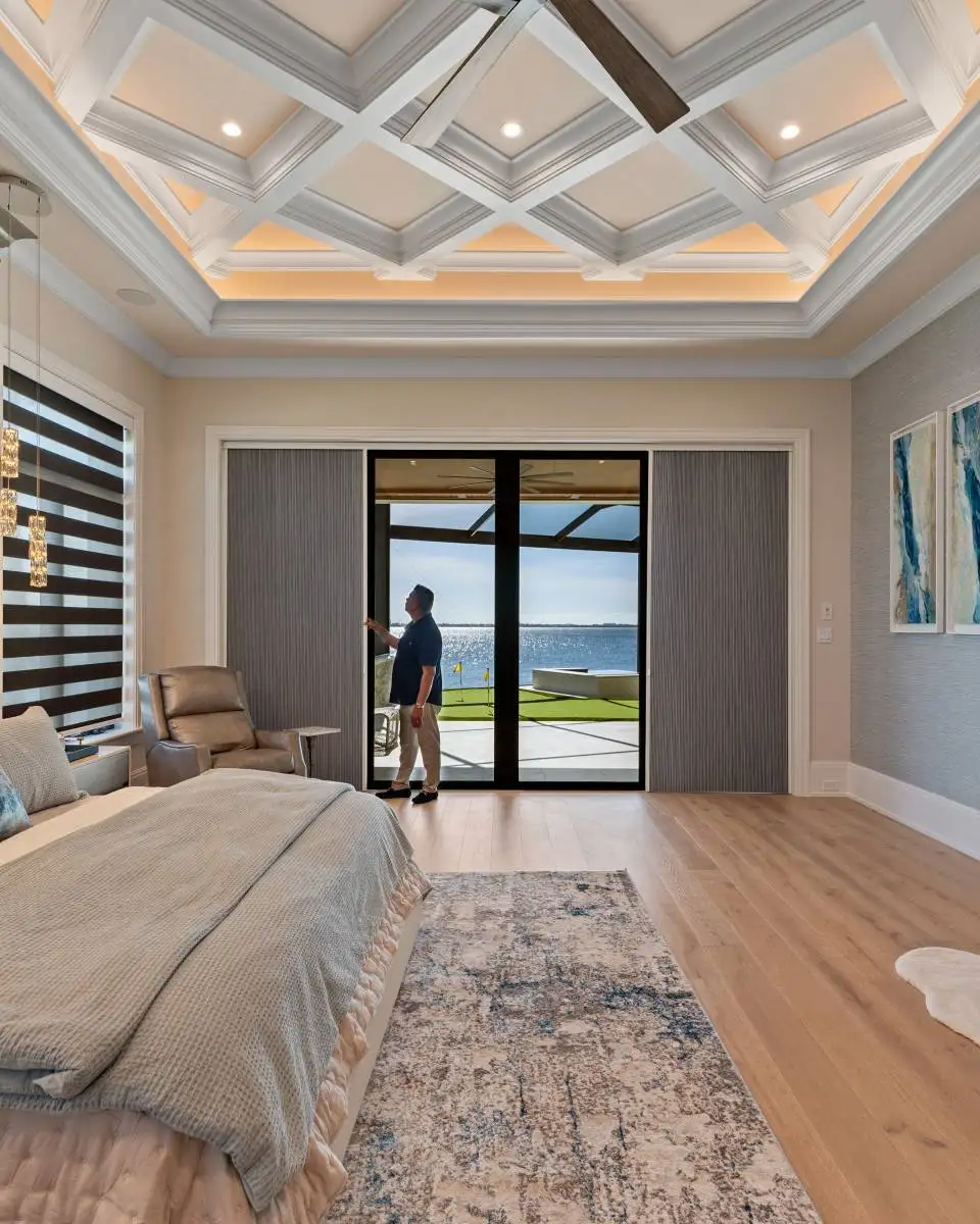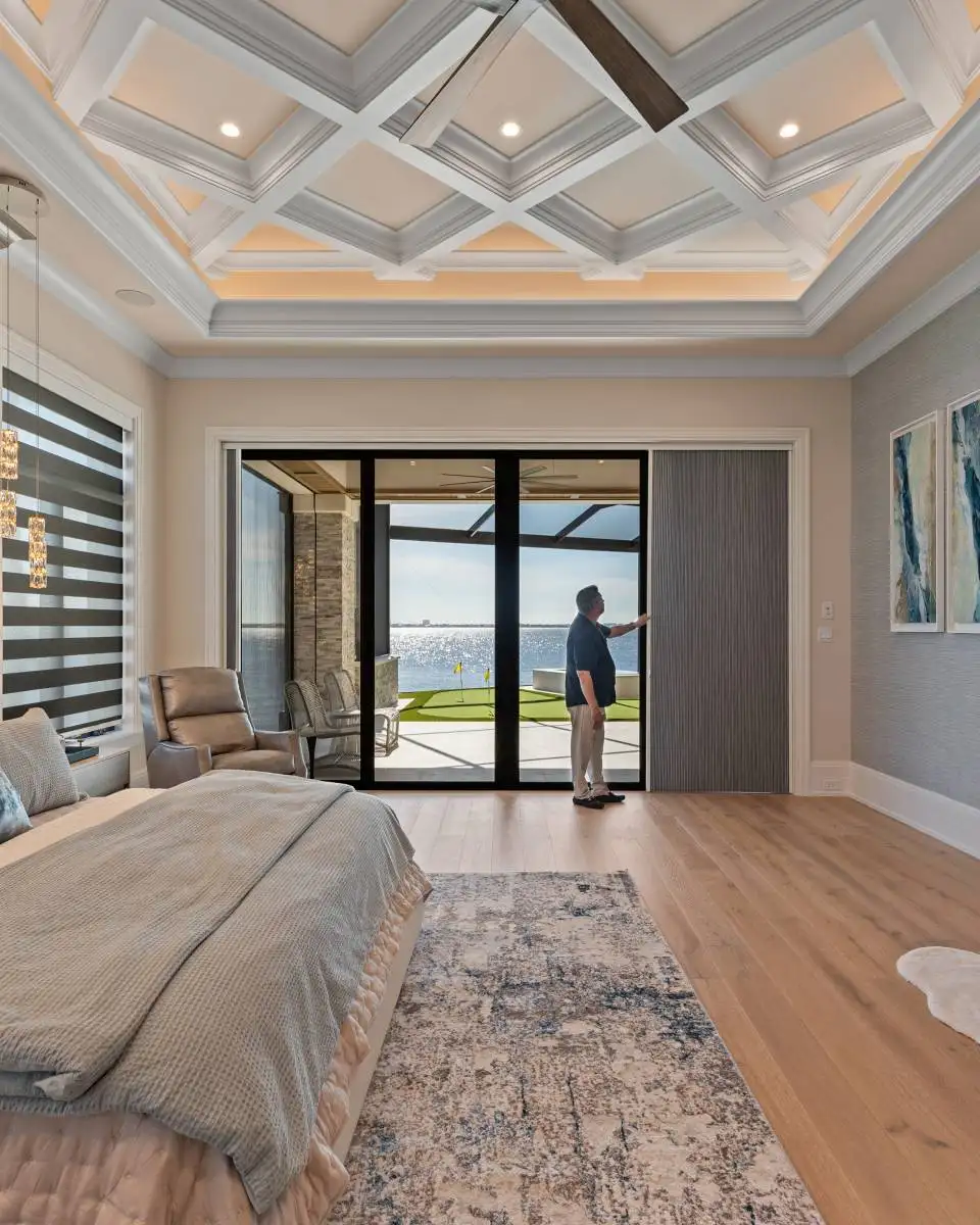 Solar screen shades and motorized sheers provide glare control while preserving views of the Gulf or canals.