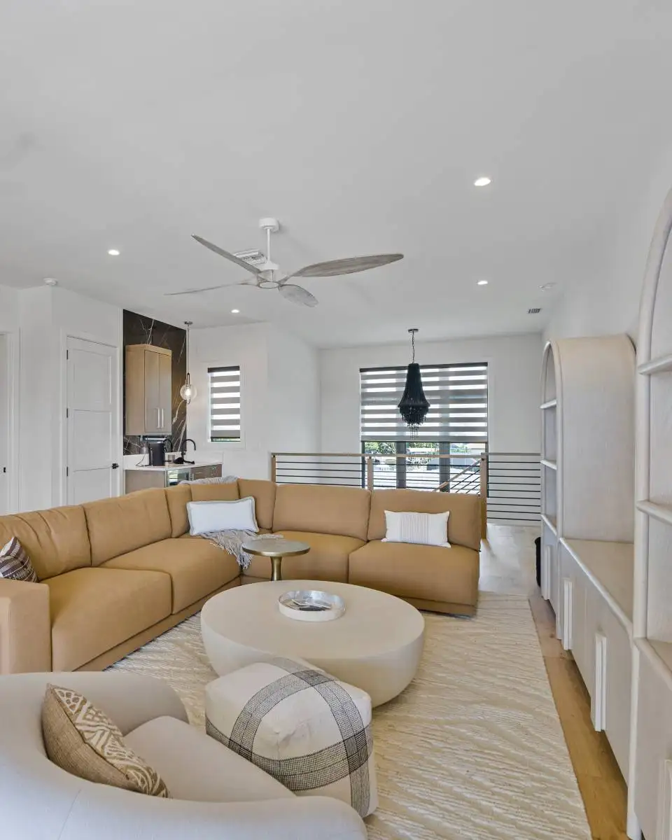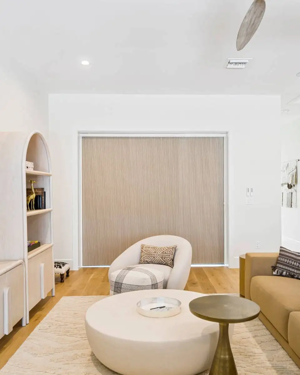 Top-down bottom-up shades and layered sheer drapes offer flexible privacy while maintaining style.